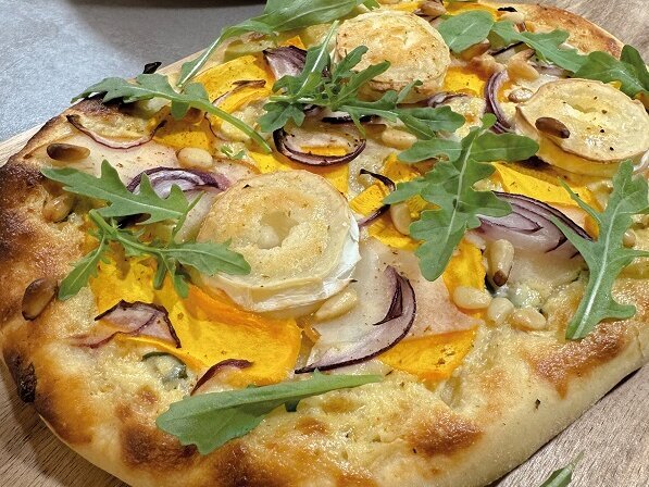 - Die Crème Fraiche-Masse auf den Fladen verteilen und glattstreifen, anschließend Kürbisscheiben, Birne und Zwiebel darauf verteilen. Pinienkerne darüberstreuen und zuletzt den Ziegenkäse auf die Fladen legen.