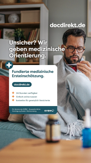 Oft treten gesundheitliche Beschwerden plötzlich auf, wenn keine Arztpraxis erreichbar ist – abends, am Wochenende oder an Feiertagen: eine heftige Erkältung, Fieber, Rückenschmerzen, Übelkeit, eine Blasenentzündung. Patienten in Baden-Württemberg können jetzt zusätzlich zum Ärztlichen Bereitschaftsdienst (bundesweite Rufnummer 116117) docdirekt.de ansteuern.